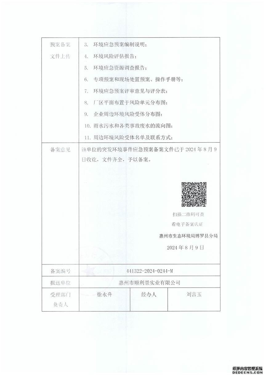 已制訂《惠州市順利景實業(yè)有限公司環(huán)境風險評估報告》,并于2024年8月9日上報博羅縣環(huán)境保護局備案; |