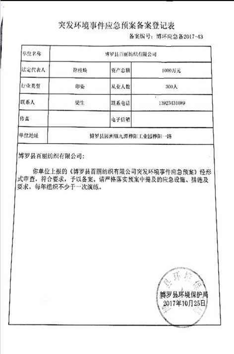 已制訂《博羅縣百麗紡織有限公司突發(fā)環(huán)境事件應急預案》,并于2017年 10月25日在博羅縣環(huán)境保護局備案,