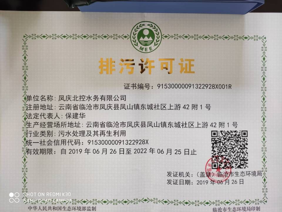 附件鏈接:鳳慶北控水務(wù)有限公司排污許可證正本
